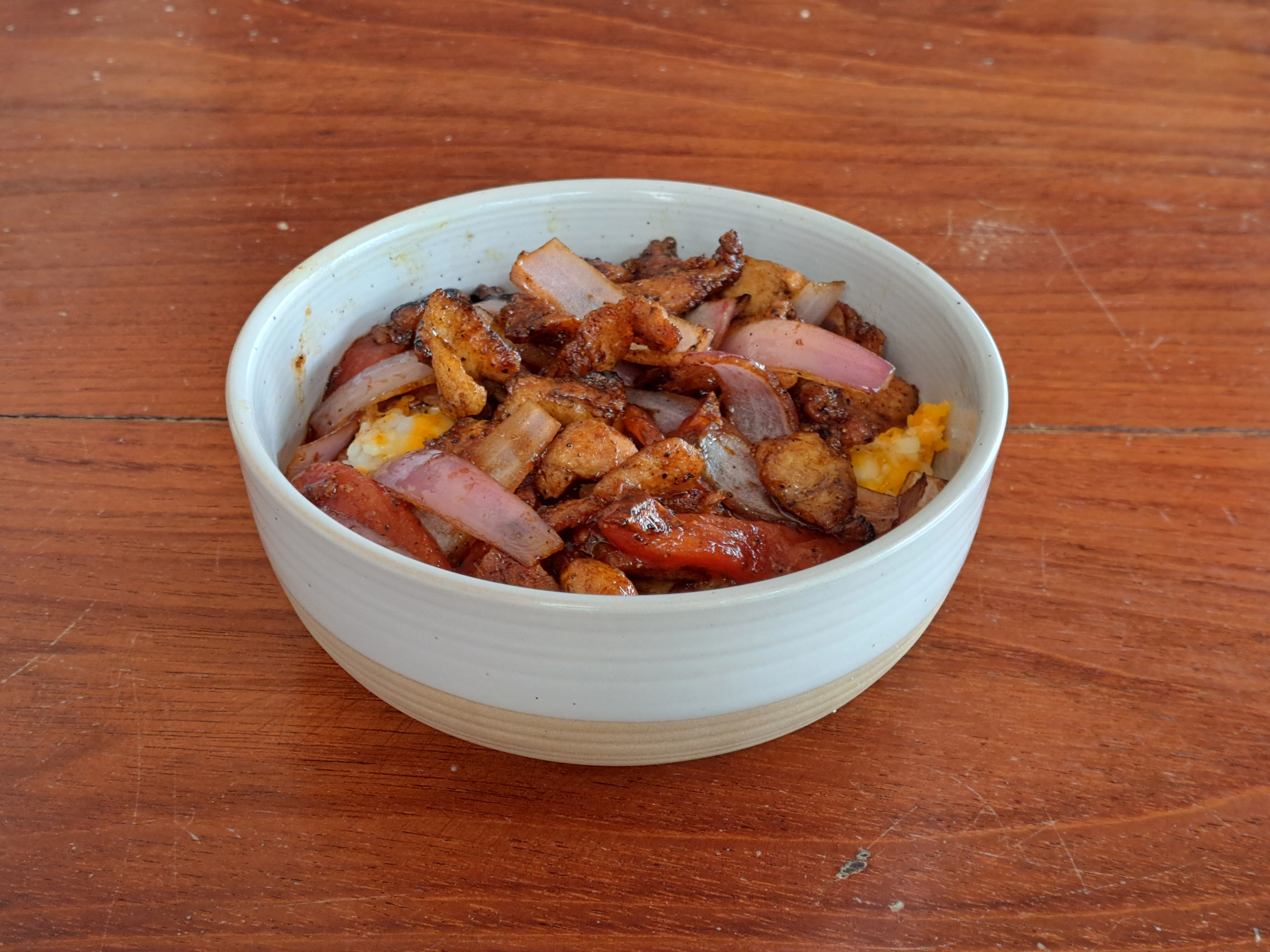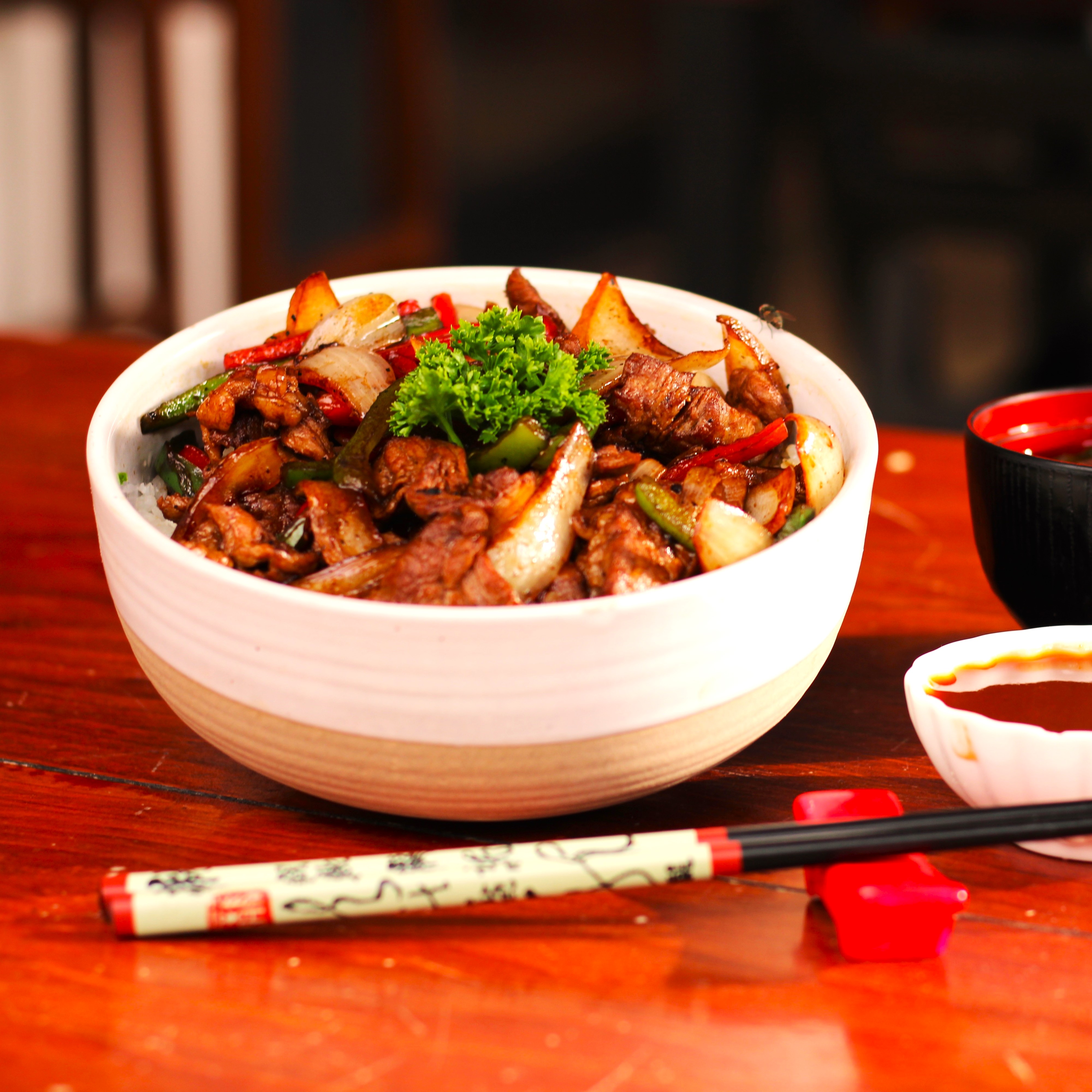 arroz cubierto con carne de ce..